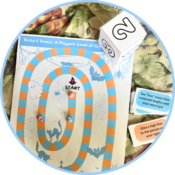 That’s why I created Ploppals Trick & Treat — a spooky-silly printable game that helps families, classrooms, and communities enjoy Halloween without the sugar overload or the pressure to buy more stuff.